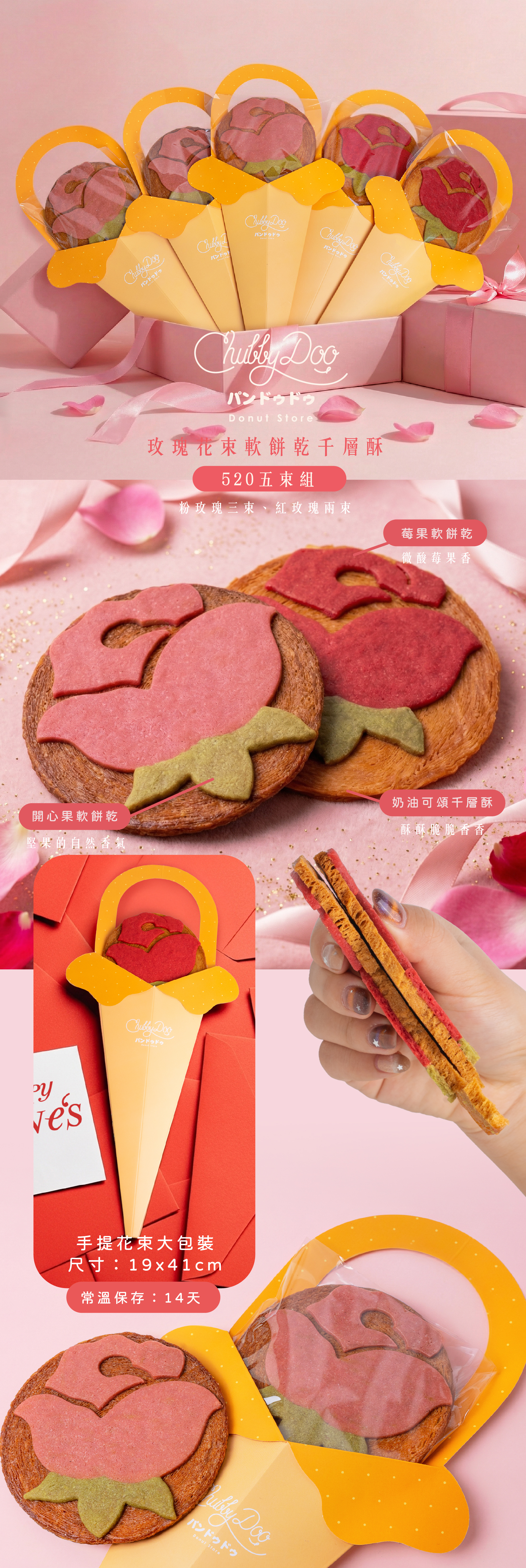 五束組 粉玫瑰紅玫瑰 莓果花束軟餅乾千層酥
